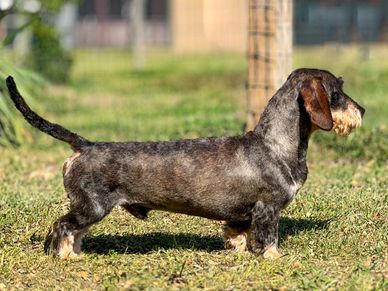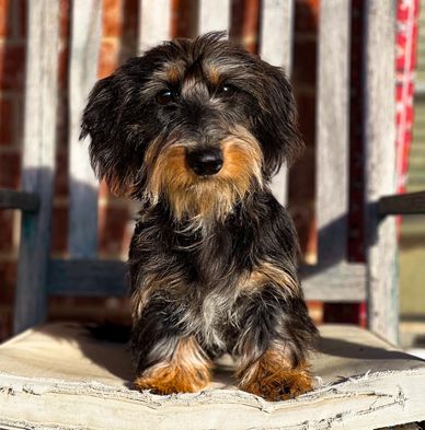 Suki is a beautiful wild boar wirehair female mini dachshund . She has an exceptional coat and an equally exceptional personality. She is a calm girl with all the qualities of sophisticated royalty. She enjoys her outdoor time as much as her indoor time! Suki is 14 pounds and AKC registered. Her DNA testing is completed via Optimal Selection and she is PRA clear.